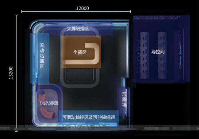 全媒體演播室細分為六個區域(圖1),分別為坐播區、大屏站播區、流動站播區、沙發訪談區、可滑動觸控屏站播區及可伸縮虛擬摳像區,充分合理利用空間。演播室整體線條設計連貫,滿足坐播、站播、互動播出等節目形態,各景區可滿足獨立節目或同一節目不同版塊製作。同時,兼顧不同區域互動需求,滿足全景、中景、特寫等全方位鏡頭拍攝需要。